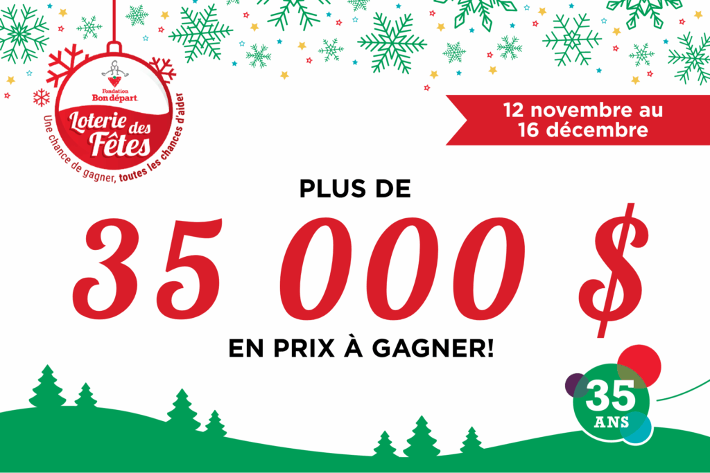 Du 12 novembre au 16 décembre 2025, participez à la Loterie des Fêtes de la Fondation Bon départ de Canadian Tire du Québec et courez la chance de gagner l’un des 21 prix, d’une valeur totale de plus de 35 000 $ dont un grand prix en argent de 15 000 $!